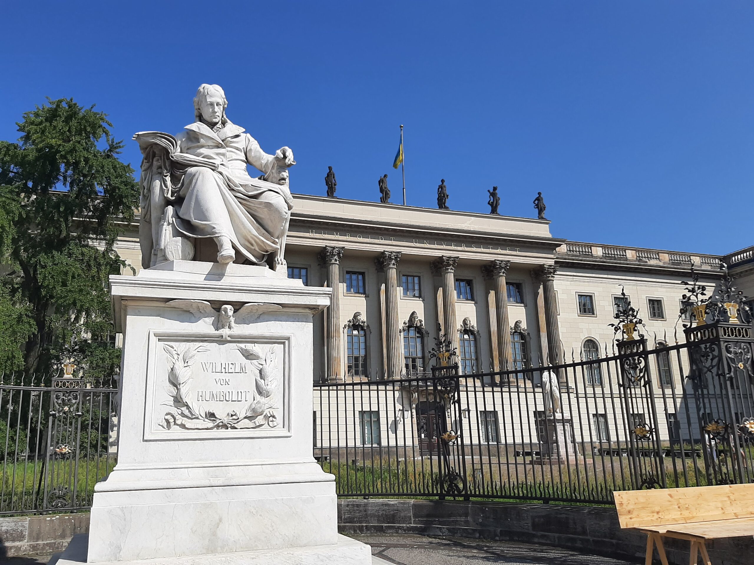 Пътьом хвърлям поглед към вътрешния двор на Държавната библиотека (Staatsbibliothek), върху чиято лицева фасада се вее огромен украински флаг. Макар и събрала в себе си несметни писмени съкровища, по времето на Хитлер този двор става арена на огромни клади. Хиляди томове от автори, считани от нацистите за ненадеждни, са хвърлени на купчина в пламъците. Карл Маркс, Зигмунд Фройд, Томас и Хайнрих Ман и Бертолт Брехт, Ерих Мария Ремарк са само някои от писателите, чиито произведения е трябвало да бъдат „изчистени“. В една от залите на библиотеката се намира горчивият мемориал „Празната стая“, който представлява помещение, обзаведено със зловещо празни, бели книжни полици, гледани през стена от плексиглас.