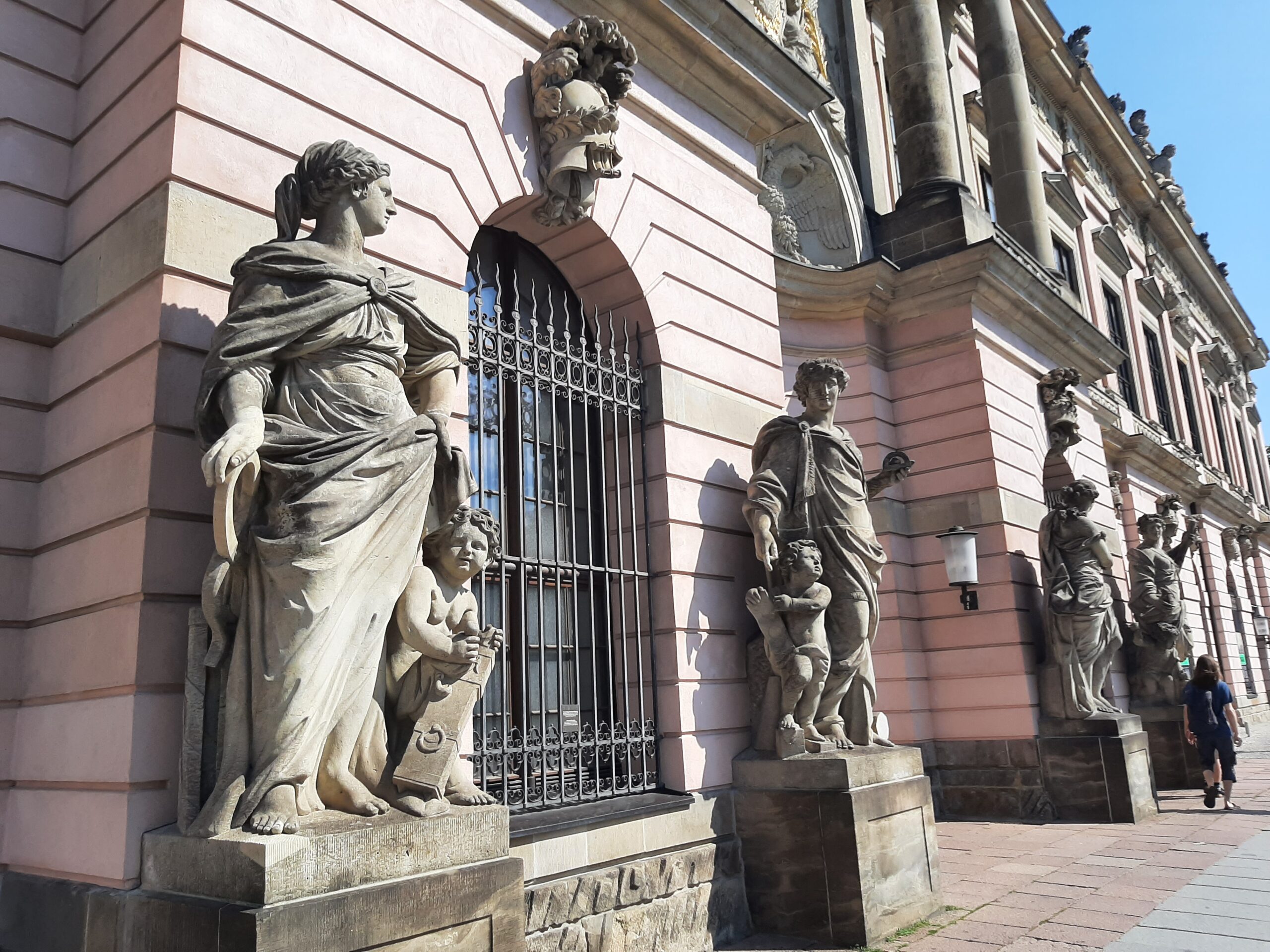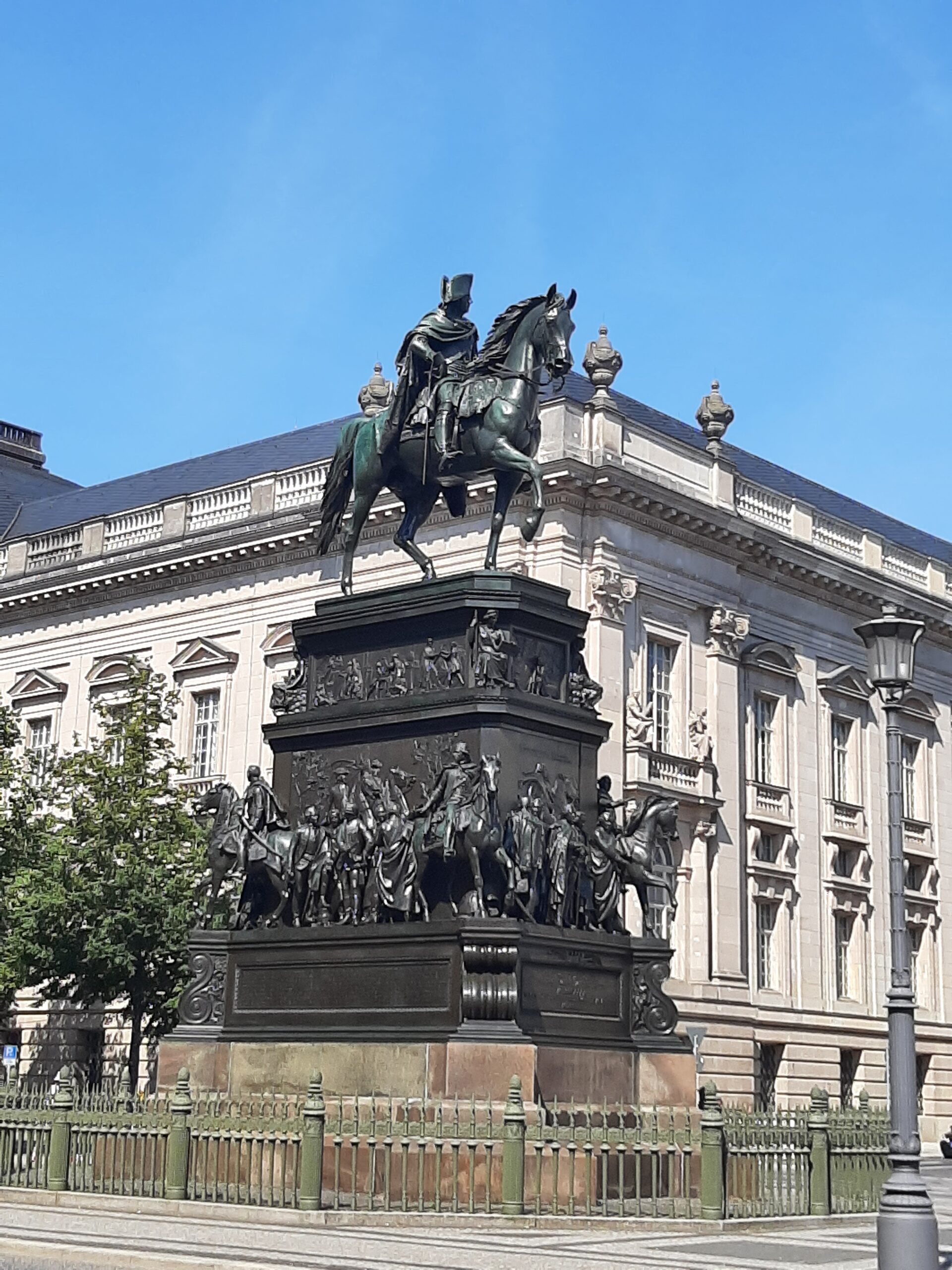 На средната лента на „Унтер ден Линден“ се издига гордо конната статуя на Фридрих Велики. Голяма част от „Унтер ден Линден“ е разрушена по време на Втората световна война. Днес е трудно да се оцени тази разруха. Най-разкошните сгради (като Старият дворец, Държавната опера и Опернпале) са реставрирани или изградени наново в блясъка на старата си слава. В съседство с библиотеката се намира седалището на Хумболтовия университет. Главната постройка е издигната през XVIII век като дворец на принц Хайнрих Пруски. Широкият меден купол в югозападния ъгъл на „Бебелплац“ отсреща принадлежи на главната католическа църква на града.