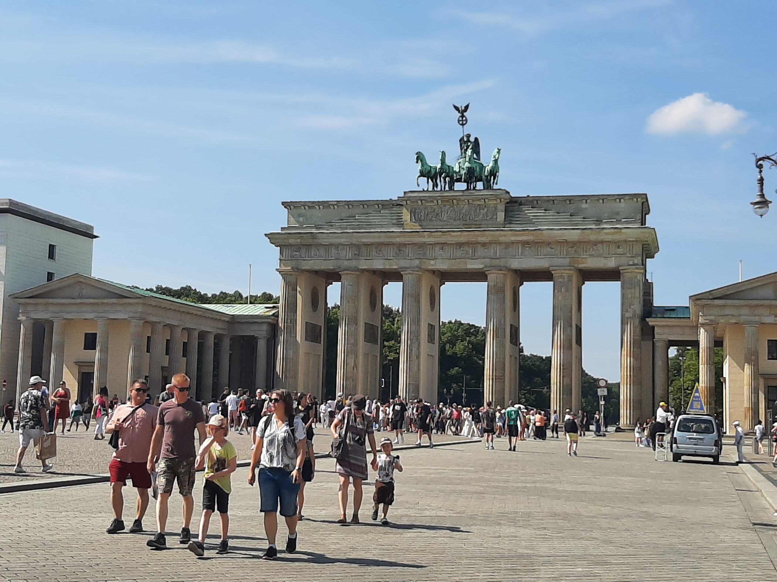 Следващата спирка от нашата разходка беше Бранденбургската врата, която е замислена като символ на триумфа на мира. Медната скулптурна група Квадрига (Quadriga) представлява богинята на мира Ейрене, влизаща в града на колесница, теглена от четири коня. Оригиналът е силно разрушен през Втората световна война.