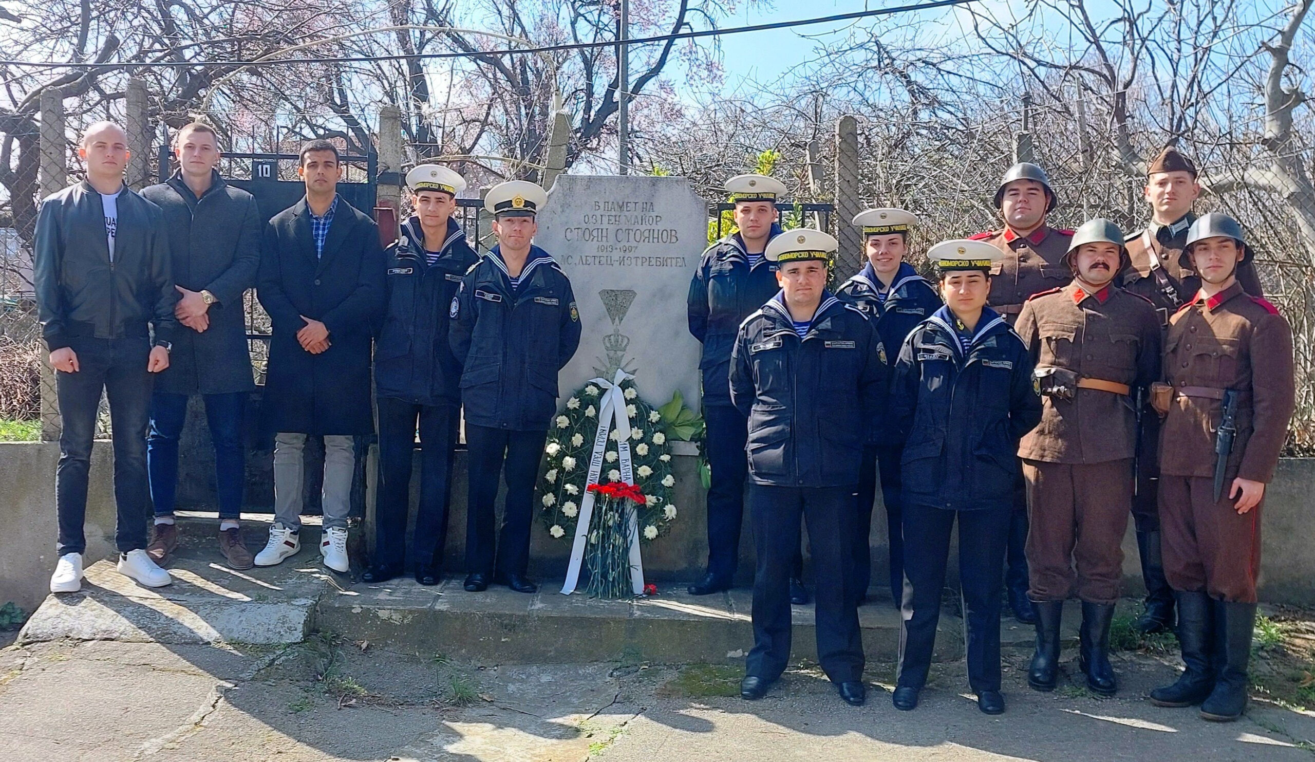 По своя инициатива, в деня за отпуск, курсанти от ВВМУ „Н. Й. Вапцаров“ отбелязаха годишнините от рождението и смъртта на генерал-майор Стоян Стоянов (1913-1997), навършили се през съответно на 12 и 13 март. След словото на командира на курсантския дивизион мичман Димо Савов в чест на големия ни въздушен ас, главните старшини Благовест Лигов и Мартин Петров, старшина I степен Виктор Ценов, старшините II степен Мартин Тарашанов и Ивета Тодорова, курсантите Йоан Димитров, Николай Шапков и Селин Маджар поднесоха цветя на паметната плоча в кв. Галата, отдавайки почит на летеца-изтребител с 15 въздушни победи в защита на българското небе от англо-американските бомбардировачи по време на Втората световна война. Съдействие им оказаха членове на Клуба за военноисторически реконструкции „Братя по оръжие“: Пламен Стоев, развял реплика на българско бойно знаме, Симеон Василев, Димитър Гочев и старшина II степен Тодор Тачев – курсант от ВВМУ, специалност „Военен лекар“. Те бяха облечени в български военни униформи от периода на Втората световна война, допринасяйки за оригиналността на осъщественото начинание.