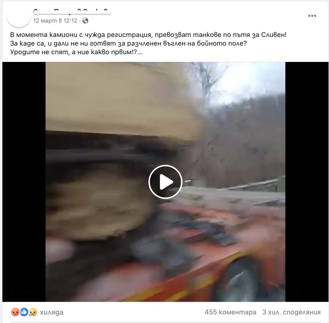 Така например в широко споделяно във Фейсбук видео от 12 март се виждат камиони с чужда регистрация, които превозват тежка военна техника. В описанието на клипа се посочва, че той е заснет по пътя за Сливен и се превозват танкове. Авторът на видеото пита „За каде са, и дали не ни готвят за разчленен въглен на бойното поле?“ (оригиналният правопис е запазен, бел. ред.)“